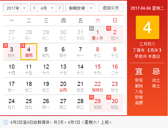 2017年4月2日至4月4日,放假3天。