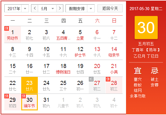 2017年5月28日至5月30日,放假3天。