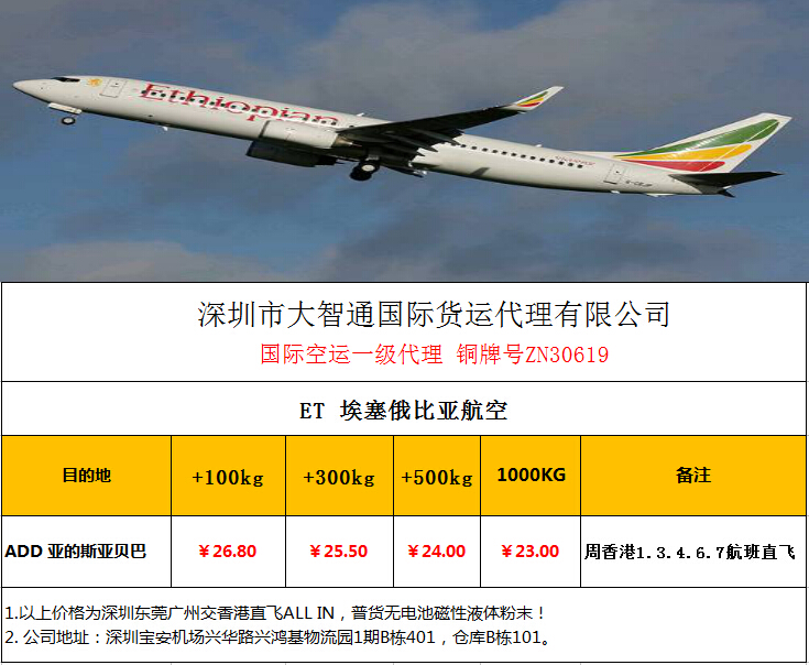 香港直飛,ADD亞的斯亞貝巴新空運(yùn)價(jià)格,清關(guān)快捷安全方便,為你提供一站式的服務(wù)保障!價(jià)格低,時(shí)效快。深圳大智通國(guó)際空運(yùn),20年老牌,值得