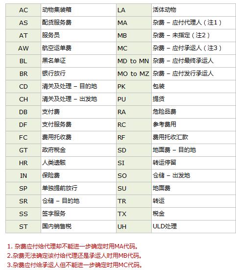 a.除了必需填寫重量費及從價費之外的其它收費及費用的說明及金額。電子傳送航空運單時,要使用下列代碼: