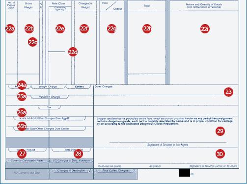 本欄必需填入應(yīng)付承運人和應(yīng)付代理的全部到付費用,比如,重量/容積費、從價費以及其它預(yù)付費用。