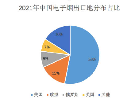 據(jù)《2021電子煙產(chǎn)業(yè)藍皮書》數(shù)據(jù)顯示,中國電子煙出口額前三位的目的國家或地區(qū)分別是美國、歐盟及英國、俄羅斯,占比分別為53%、22%、9%。
