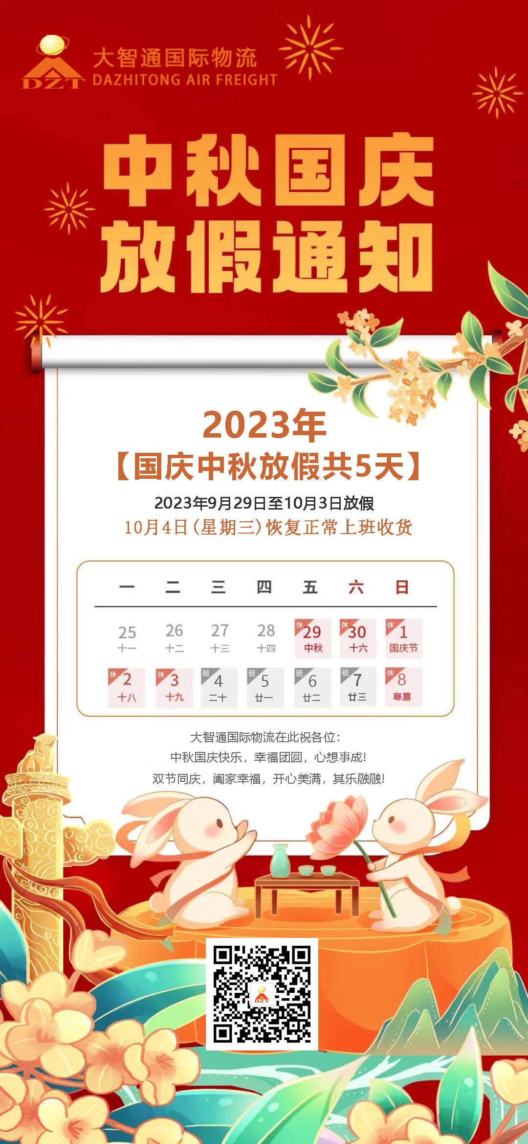 正值中秋國慶佳節(jié)歡度之際,大智通物流全體員工在此感謝您長期以來對我們的支持與厚愛!2023年我司”中秋&國慶節(jié)放假通知“如下: