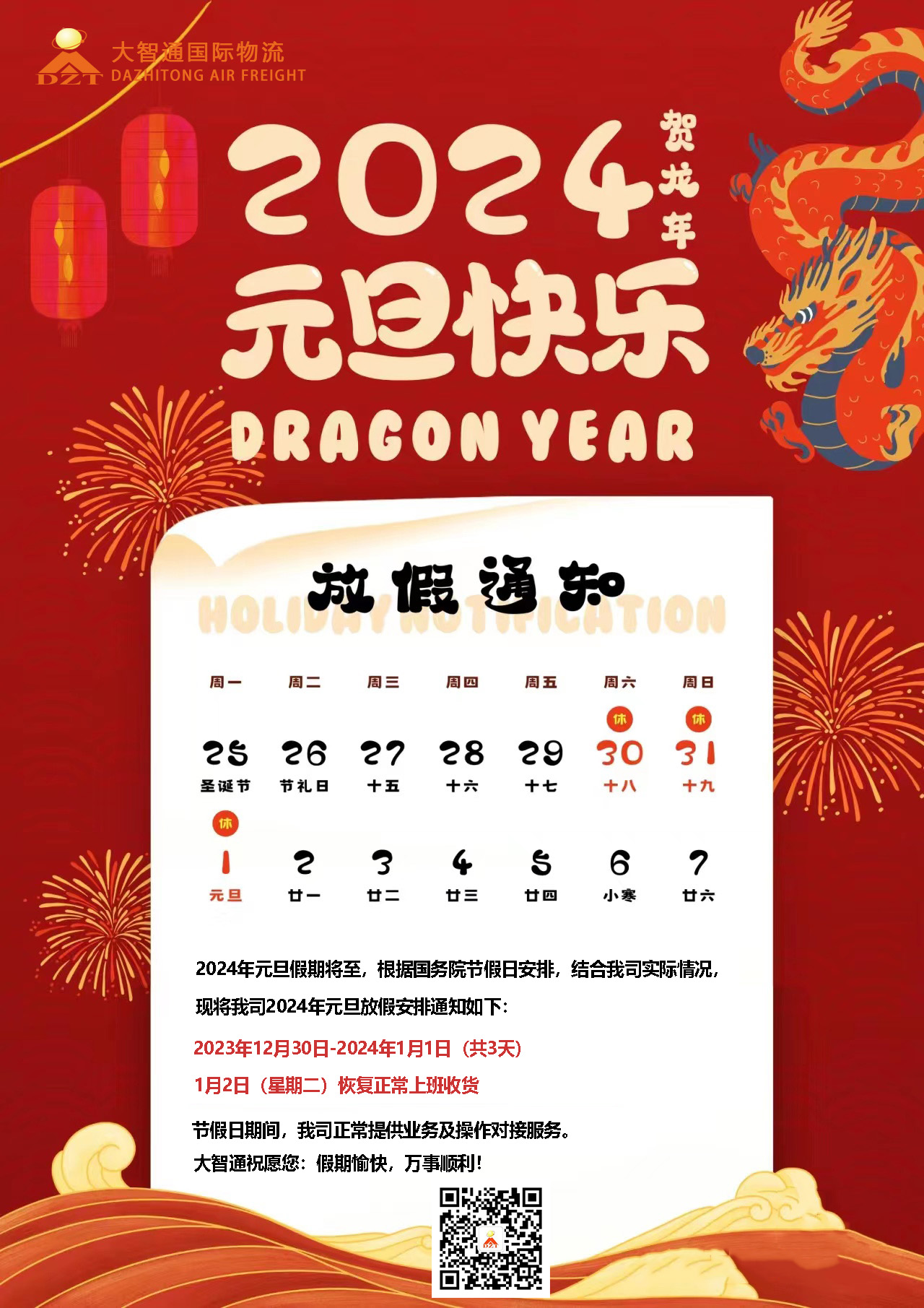 一,2023年12月30日和2024年1月1日,放假3天,12月31日(星期日)倉庫正常上班收貨