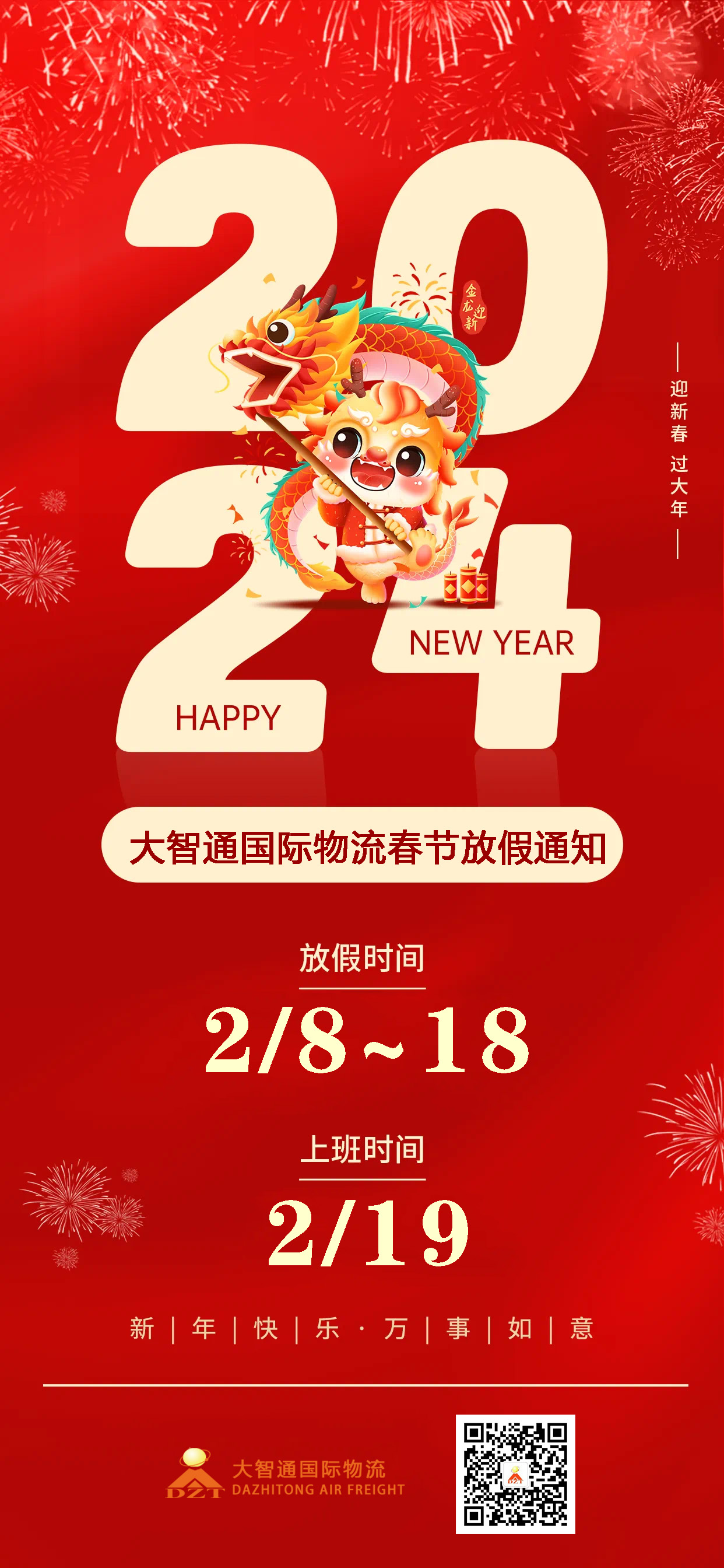 喜迎新春,萬象更新,深圳市大智通國際貨運代理有限公司全體員工在此感謝您長期以來對我們的支持與厚愛!在新的一年里,我們會更努力,給您提供更優(yōu)質(zhì)的服務(wù)!2024年我司“春節(jié)放假通知”如下: