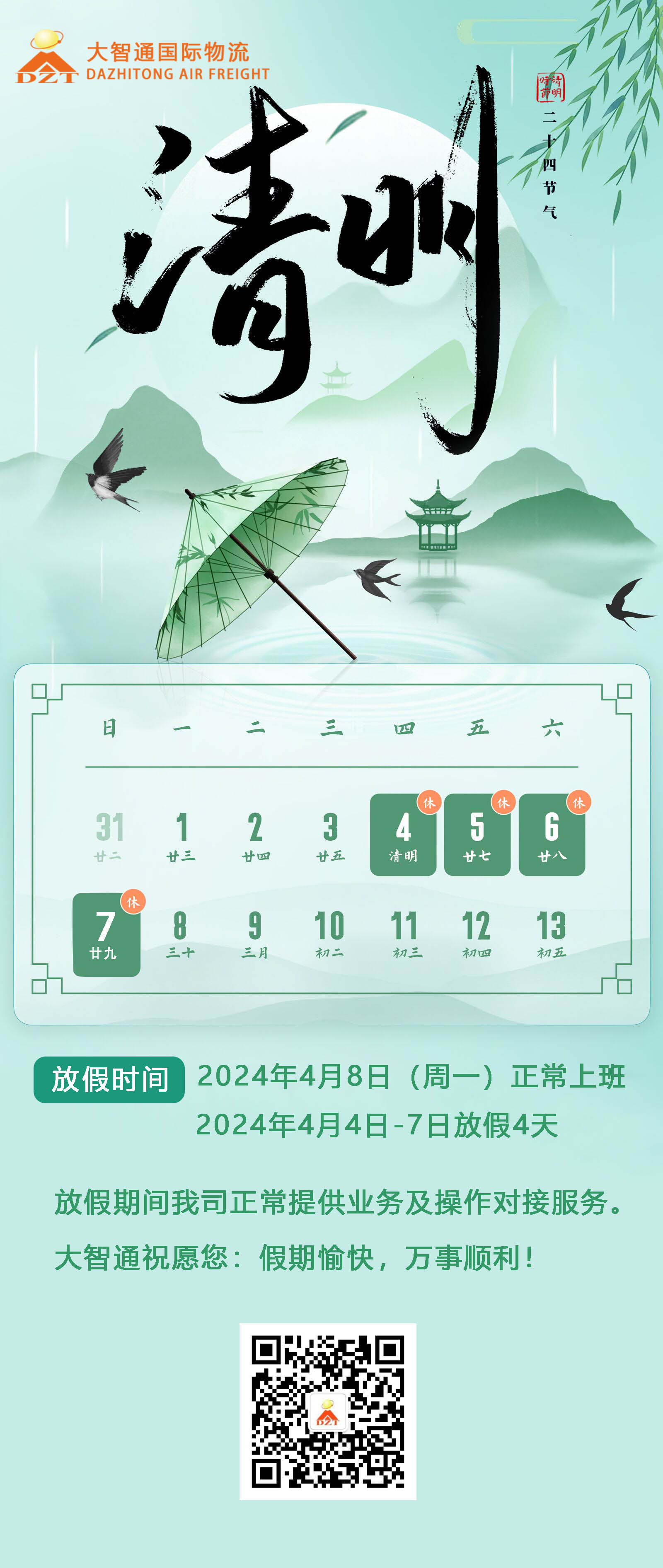 2024年4月4日-7日(清明節(jié))放假,共4天。