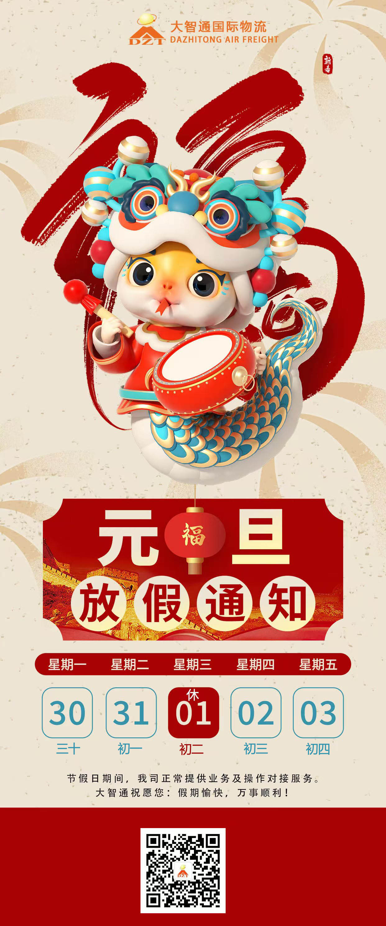 您好!喜迎新年,感謝貴司在2024年給予我們的鼎力支持。在新年來臨之際,深圳市大智通國際貨運代理有限公司全體員工祝您和您的家闔家歡樂,萬事如意!根據(jù)國務(wù)院相關(guān)規(guī)定,結(jié)合我司實際情況,現(xiàn)將我司2025年元旦節(jié)放假具體安排如下: