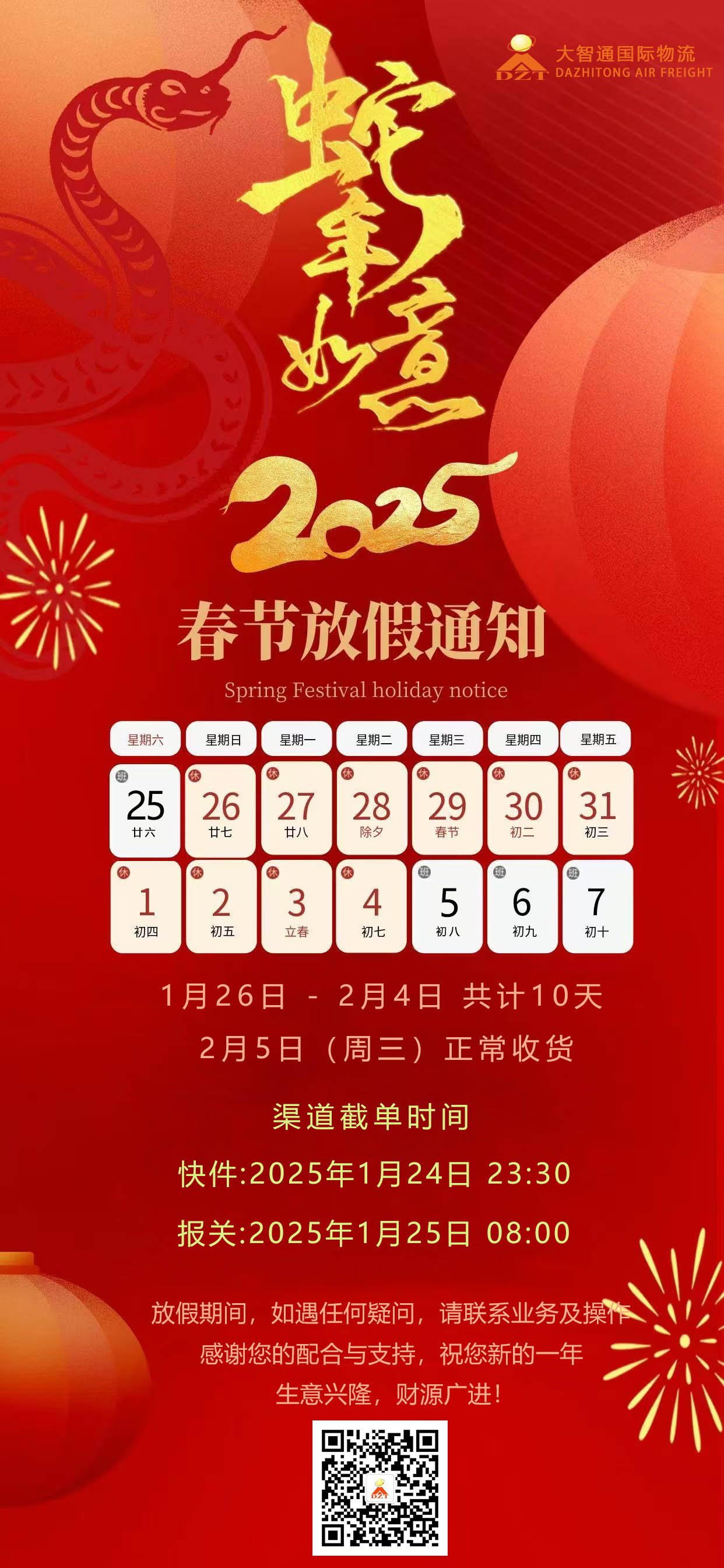 感謝您過去一年對大智通物流的支持與信賴。結(jié)合實際業(yè)務情況,我們特此通知您,春節(jié)放假時間安排如下:
